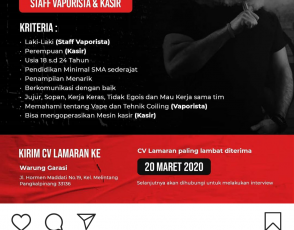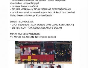 Persyaratan: perempuan berhijab, diutamakan dari luar sungailiat,disediakan tempat tinggal, minimal tmat SMA/SMK, belum menikah/tidak sedang dalam pendidikan.