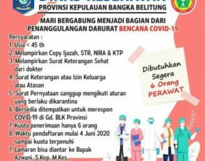 Melampirkan Copi ijazah , STR, NIRA & KTP, surat keterangan atau izin dari keluarga, Bersedia ditempatkan untuk merespon CIVID-19 di gedung BLKI Provinsi..