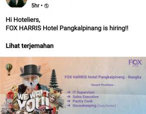 iT Supervisor, Sales Executive, Pastry cook & Housekeeping @Fox Hotel Harris-Pangkalpinang