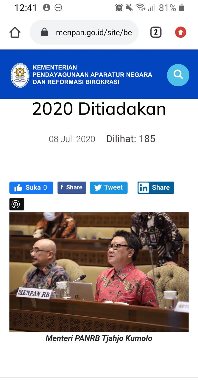 Tahun ini pemerintah masih akan menuntaskan proses seleksi CPNS formasi tahun 2019 yang tertunda karena pandemi Covid-19. “SKB akan dilanjutkan bulan September-Oktober 2020 dengan menerapkan protokol kesehatan. Kementerian PANRB dan BKN terus melakukan koordinasi dengan BNPB (Gugus Tugas Covid-19) dan Kementerian Kesehatan, untuk memastikan agar pelaksanaan SKB benar-benar memenuhi standar protokol kesehatan,” jelasnya.